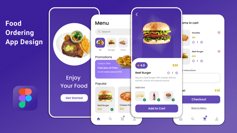 - Neat UI design for Splash, Menu, Item details, Cart, Checkout, Order completed screens